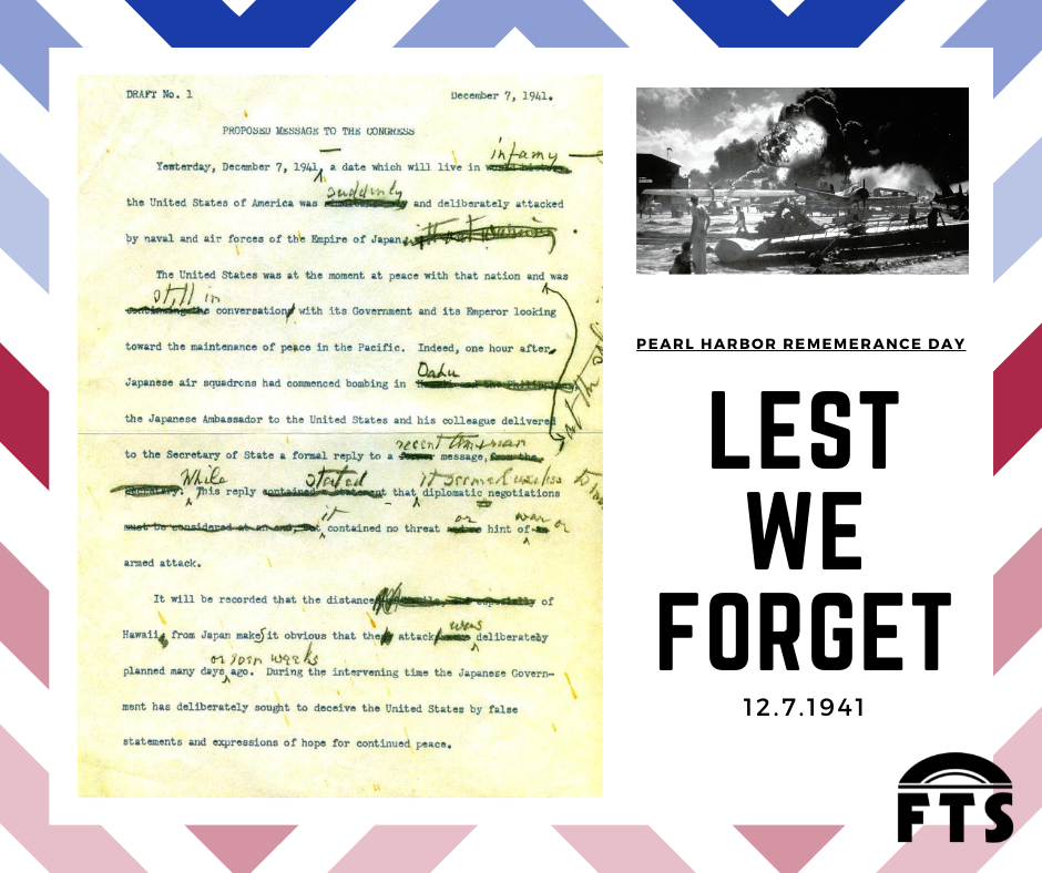 Pearl Harbor Remembrance DayFTS DispatchDec 7, 20211 min readEighty years ago today, over 2,400 Americans lost their lives in the attack of Pearl Harbor. Today we remember them, and all those who fought to protect our freedom.
